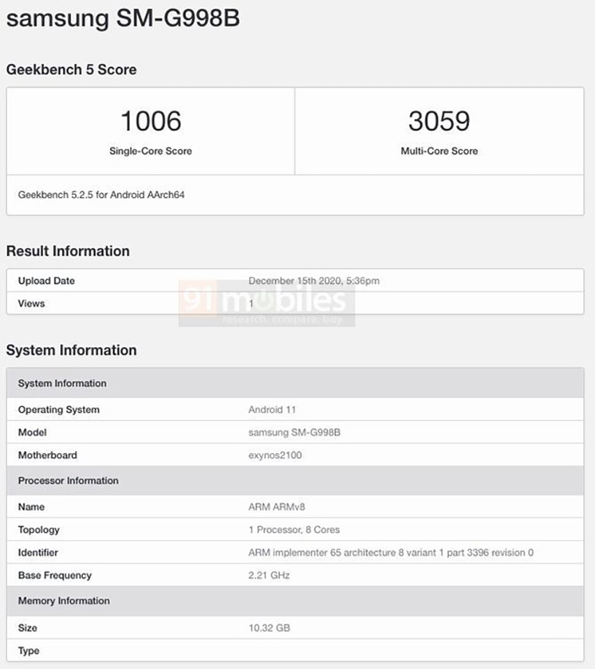 Như bạn có thể thấy ở hình ảnh trên, phiên bản Galaxy S21 Ultra xuất hiện trên Geekbench đi kèm với số model là SM-G998B. Tại đây, điện thoại này được phát hiện sử dụng chipset Exynos 2100, có 8 nhân xung nhịp 2.21GHz, cho thấy đây là biến thể toàn cầu. SoC sẽ nhận được sự hỗ trợ từ dung lượng RAM lên tới 12GB và hệ điều hành Android 11 mới nhất.