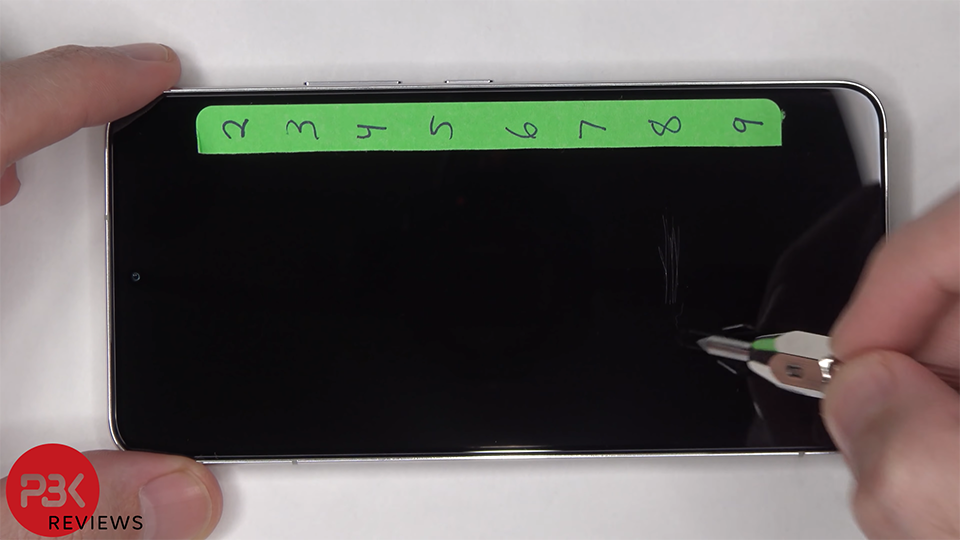 Bắt đầu với bài kiểm tra độ xước, màn hình của Galaxy S22 được bảo vệ bởi một lớp kính Gorilla Glass Victus+, nên chỉ xuất hiện các vết xước ở mức độ 8 và 9 theo thang độ cứng Moh. Trong khi mặt sau sử dụng cùng một loại kính nhưng lại dễ trầy xước hơn rất nhiều.