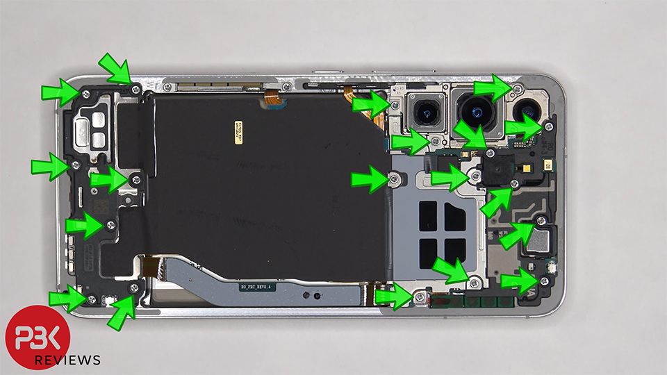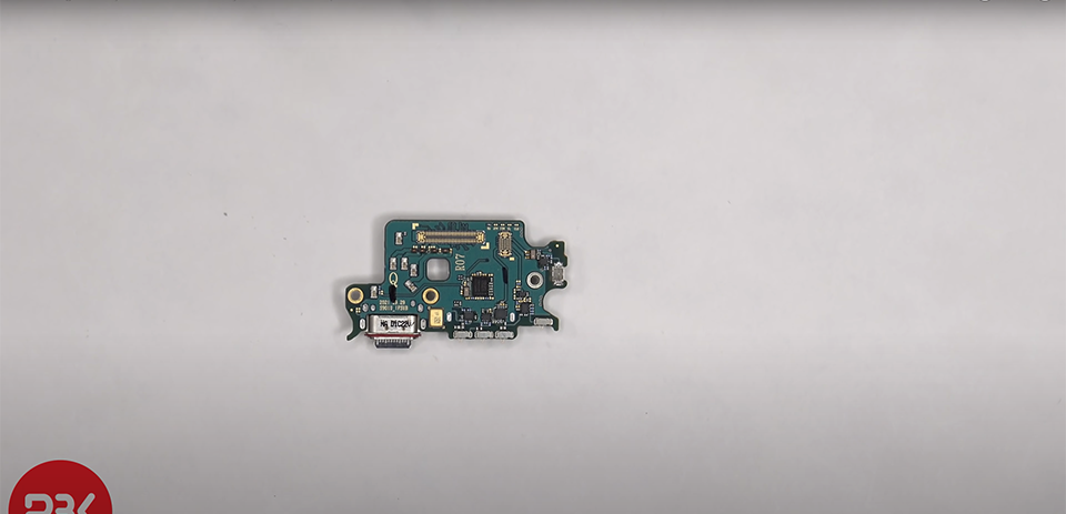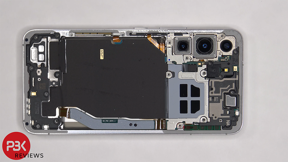 Bo mạch chủ của Galaxy S22 được giữ cố định bằng 19 con vít và nhiều đầu nối. Việc cạy các dây cáp uốn cong của pin và nắp nhựa phía trên giúp giải phóng bo mạch chủ nằm bên dưới, nơi chứa các linh kiện quan trọng như chipset, RAM, bộ nhớ và ba camera phía sau. Cảm biến chính 50MP và ống kính tele 10MP đều đi kèm với OIS được hiển thị trên video.