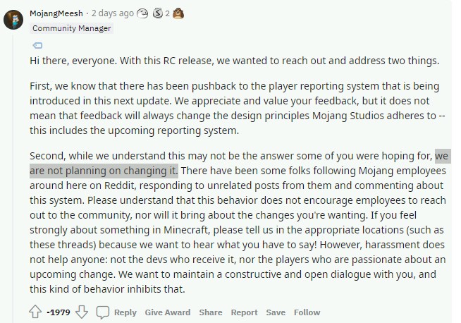 Hiện tại, cả Mojang lẫn Microsoft đều chưa đưa ra thông điệp chính thức nào về vấn đề này. Một nhân viên quản lý cộng đồng của trò chơi đã xuất hiện trên subreddit chính thức của trò chơi để chia sẻ về quyết định này, và xác nhận “chúng tôi không có kế hoạch thay đổi” và bị gần 2000 game thủ “dislike”.