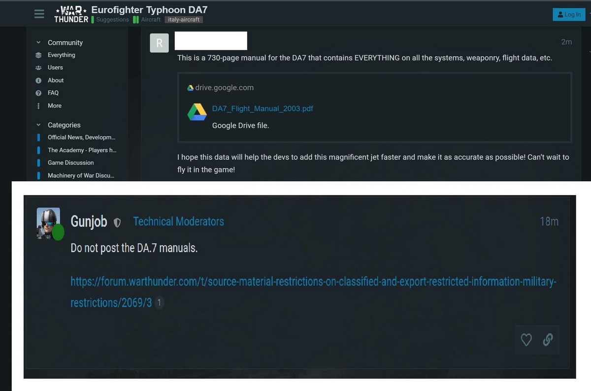 Đây là lần thứ 2 thông tin về máy bay chiến đấu bị lộ trên diễn đàn Warthunder trong chưa đầy 2 tuần. Hồi cuối tháng 8, một game thủ khác đã đăng tải toàn bộ 730 trang tài liệu về chiếc máy bay chiến đấu Eurofighter Typhoon DA7 của châu Âu. Người thực hiện hành vi này nói rằng mình 'hi vọng các dữ liệu này sẽ giúp nhà phát triển đưa nó vào game nhanh hơn và chính xác nhất có thể'.