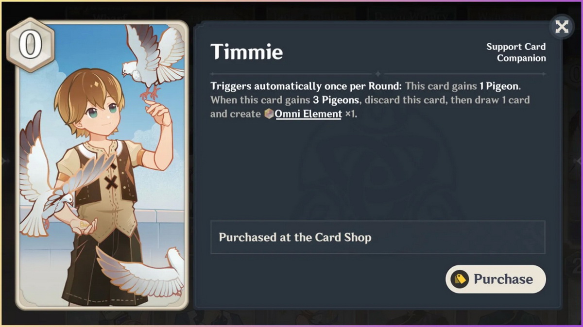 - Ở cuối mỗi vòng, Timmie nhận 1 bồ câu. Khi có đủ 3 bồ câu, Timmie rời sân, cho bạn rút 1 quân bài và tạo 1 xúc xắc nguyên tố vạn năng. Không tiêu hao xúc xắc.