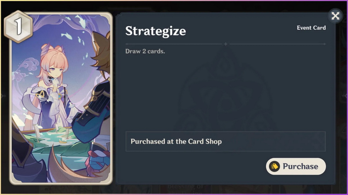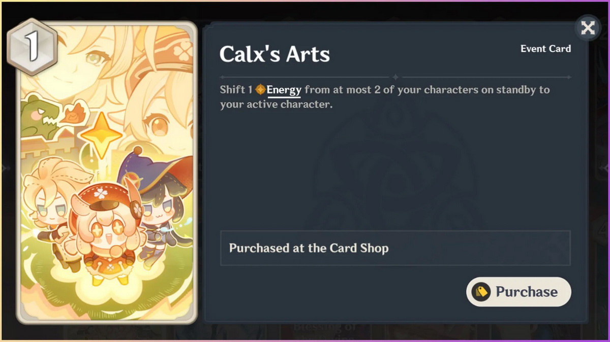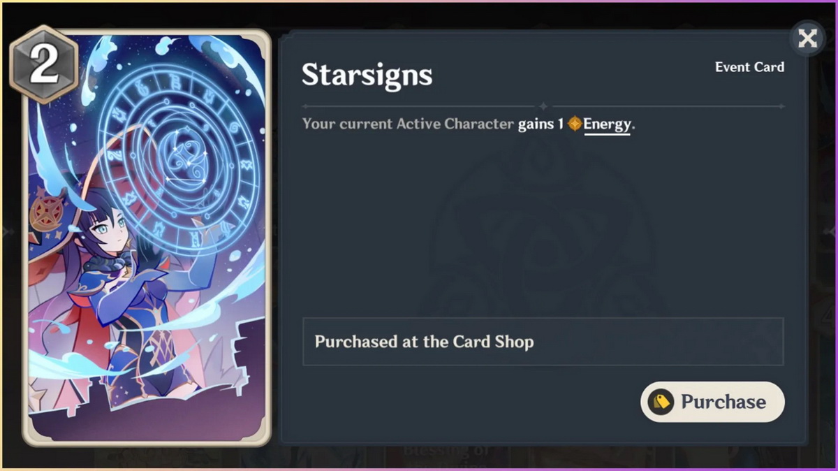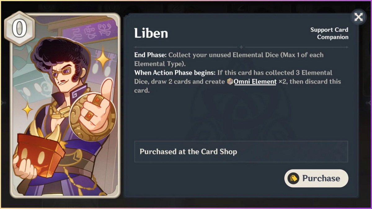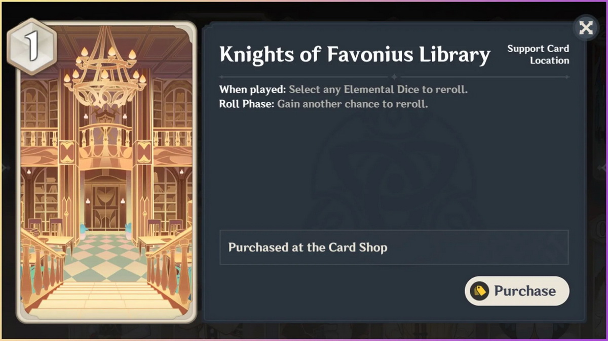 Với sự tồn tại của quân bài này trên sân, game thủ có cơ hội tung chiêu thường xuyên hơn nhờ có nhiều xúc xắc nguyên tố phù hợp. Bạn có thể mua 2 lá bài này từ shop.