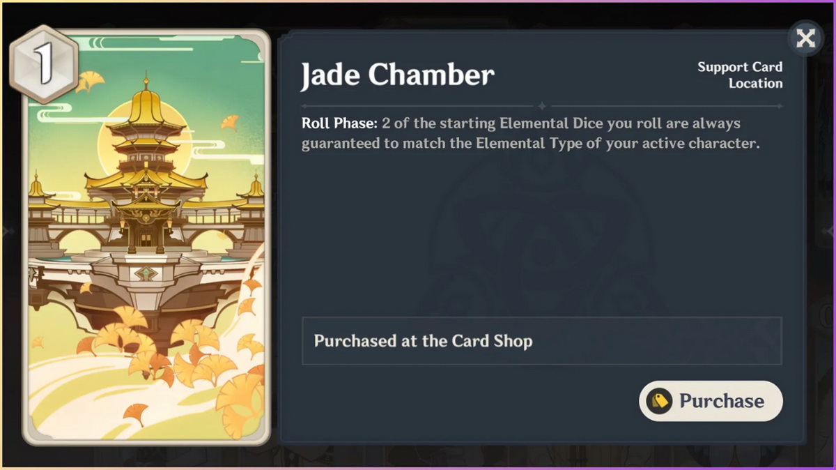 Ví dụ khi bạn có Kaeya và Ganyu trên sân, ít nhất 2 viên xúc xắc sẽ thuộc hệ Băng. Bạn nhận được 1 lá Jade Chamber khi đánh bại Bu'yun ở Liyue, và một lá khác được bán trong shop.