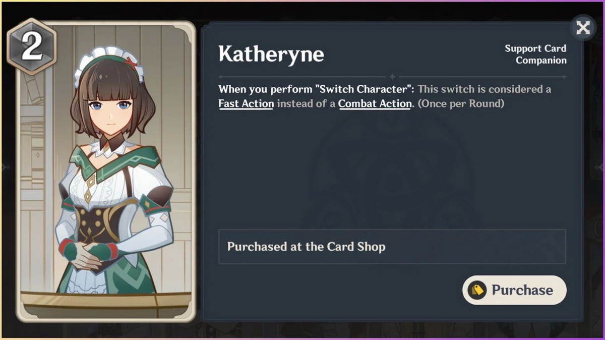 Ngay cả khi bạn đã có 2 lá Katheryne trong tay, quân bài này vẫn rất hữu ích. Bạn sẽ có nhiều cơ hội đổi nhân vật và tung combo hơn. Bạn có thể nhận 1 lá từ nhiệm vụ và 1 lá khác mua từ shop.