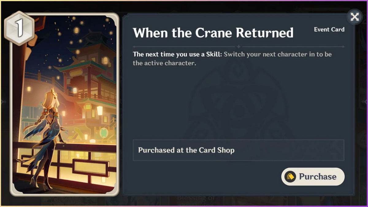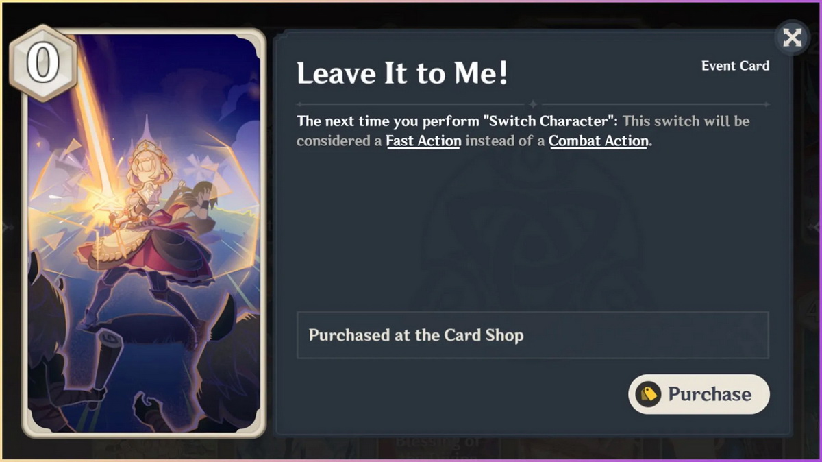 Khi tung 'Kokomi' vào sân, bạn sẽ có cơ hội lật ngược tình thế bằng cách rút thêm bài mới hữu ích hoặc dùng các lá bài này làm nguyên liệu đổi xúc xắc. Tuy nhiên hãy nhớ bạn chỉ có thể cầm tối đa 10 bài hành động trên tay và bài dư ra sẽ bị phá hủy. Bạn có thể mua 2 lá bài này từ shop.