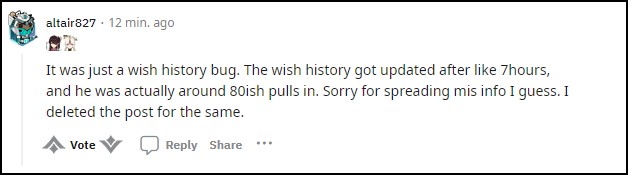 Bài đăng này đã thu hút khoảng gần 2000 lượt upvote và gần 300 bình luận, với những người tham gia 'đếm hộ' xác nhận rằng trong lịch sử quay của altair827 có đến hơn 90 lần quay trước khi Baizhu xuất hiện. Sau khi nhận được lời khuyên của cộng đồng, 'khổ chủ' xác nhận mình đã gửi ticket đến miHoYo để nhờ hỗ trợ.