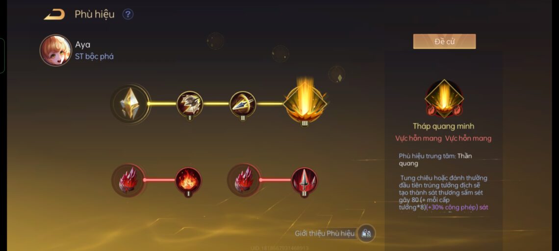 Ngoài ra, bạn cũng có thể lựa chọn bộ phù hiệu xoay quanh Ma Tính cũng cực kì phù hợp với Aya. Cách này sẽ mang lại cho Aya khả năng hồi chiêu cực đỉnh, mỗi khi dùng chiêu cuối bé con có thể tiếp tục sử dụng chiêu 1 và 2, tối ưu hóa được việc hỗ trợ cho đồng đội của mình: