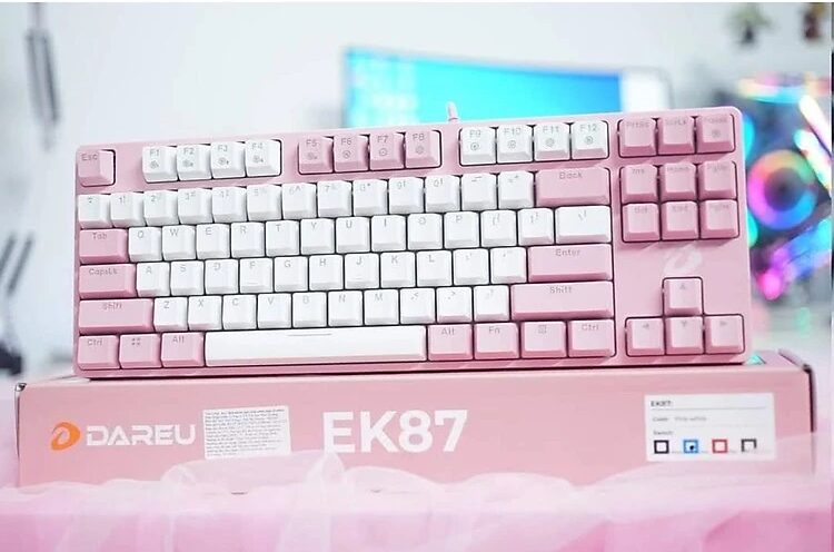 Ba mẫu chuột có lẽ đã quá đủ để anh em chọn lựa rồi, bây giờ sẽ là phần bàn phím nhé. Mẫu bàn phím đầu tiên mà mình nghĩ chị em sẽ cực kỳ thích đó chính là Bàn phím cơ có dây Dareu EK87 TKL. Không ngoại trừ tiêu chí nhất định phải có, bàn phím này có màu hồng.