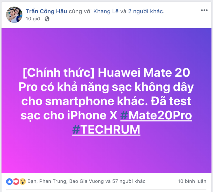 Đặc biệt, một Reporter của Techrum Việt Nam đã đăng tải dòng trạng thái khẳng định Mate 20 Pro có tính sạc không dây cho thiết bị khác.