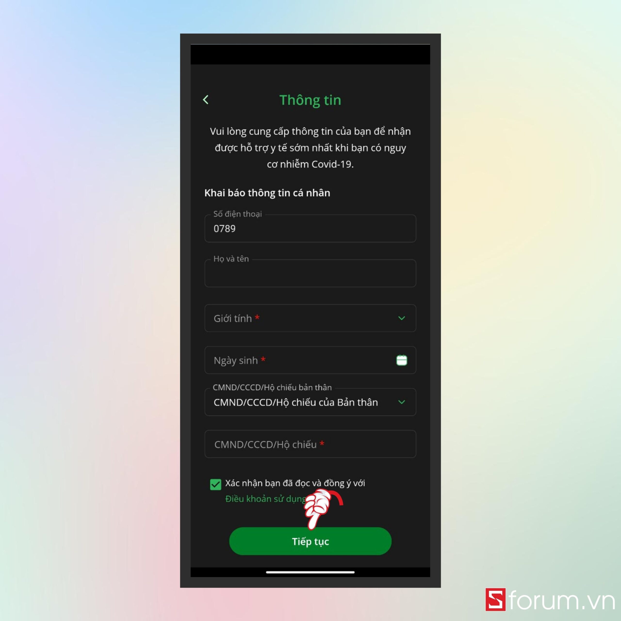 Bước 3: Tại mục thông tin, bạn hãy điền số điện thoại mà bạn muốn đăng ký tài khoản. Sau đó, bạn hãy đọc điều khoản sử dụng và chọn vào ô xác nhận khi đã đọc xong Tiếp tục.