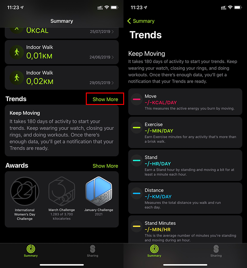 Trong khi đó, ứng dụng Fitness trên iOS 14 chỉ còn 2 mục chính: Summary (gồm 3 mục nhỏ: Activity, Workouts, Trends và Awards ) và Sharing. Kèm theo sự khác biệt về giao diện này là sự khác biệt về cách quản lý thông tin tập luyện của người dùng.