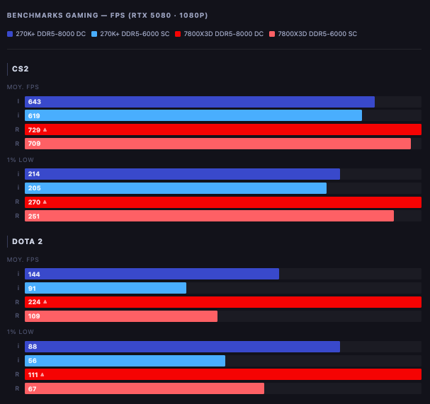 Trong CS2, AMD Ryzen 7 7800X3D đạt khoảng 729FPS trung bình (709FPS ở kịch bản RAM thấp), cao hơn đáng kể so với 643FPS và 619FPS của Intel Core Ultra 7 270K. Đáng chú ý, chỉ số 1% low của AMD Ryzen 7 7800X3D cũng vượt trội với 270FPS so với 214FPS của Intel Core Ultra 7 270K, cho thấy độ ổn định tốt hơn. Với Dota 2, khoảng cách còn rõ rệt hơn khi AMD Ryzen 7 7800X3D đạt tới 224FPS so với 144FPS, trong khi mức 1% low cũng cao hơn (111FPS so với 88FPS).