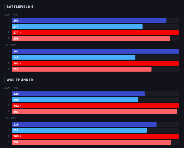 Ở Battlefield, AMD Ryzen 7 7800X3D tiếp tục nhỉnh hơn với 274FPS trung bình so với 253FPS của Intel Core Ultra 7 270K, dù chênh lệch không quá lớn. Tuy nhiên, ở War Thunder, sự khác biệt rõ ràng hơn khi AMD Ryzen 7 7800X3D đạt khoảng 402FPS, vượt xa mức 320FPS của Intel Core Ultra 7 270K. Chỉ số 1% low cũng nghiêng về AMD Ryzen 7 7800X3D với 265FPS so với 229FPS, cho thấy trải nghiệm mượt mà hơn trong các tình huống phức tạp.