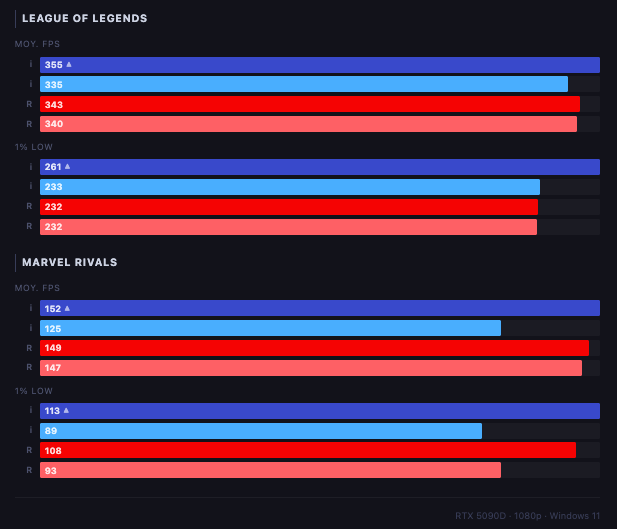 Với League of Legends, Intel Core Ultra 7 270K có lợi thế nhẹ về FPS trung bình khi đạt khoảng 355FPS so với 343FPS của AMD Ryzen 7 7800X3D. Tuy nhiên, mức 1% low của hai CPU gần như tương đương, lần lượt khoảng 261FPS và 232FPS, cho thấy trải nghiệm thực tế không chênh lệch quá nhiều. Trong Marvel Rivals, Intel Core Ultra 7 270K tiếp tục dẫn nhẹ với 152FPS so với 149FPS, nhưng AMD Ryzen 7 7800X3D vẫn giữ được độ ổn định tốt với 1% low đạt 108FPS so với 113FPS của Intel Core Ultra 7 270K trong kịch bản tối ưu.