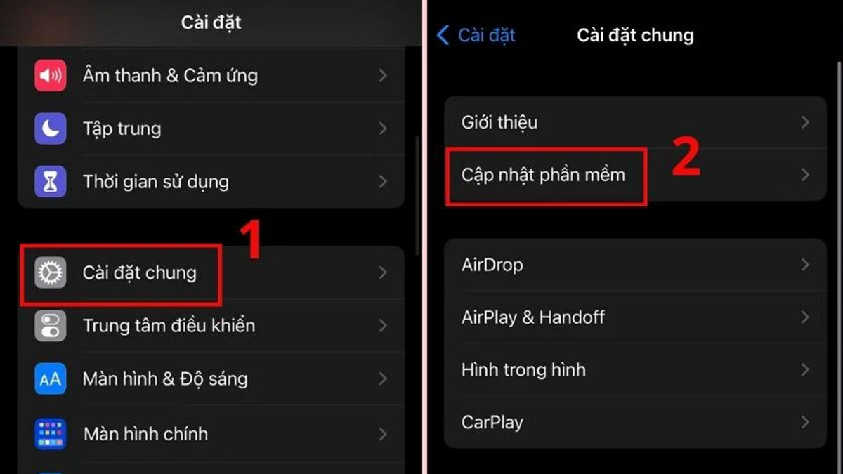 Bước 1: Tại giao diện màn hình chính, chọn Cài đặt rồi nhấn vào Cài đặt chung. Sau đó, truy cập vào giao diện Cập nhật phần mềm.