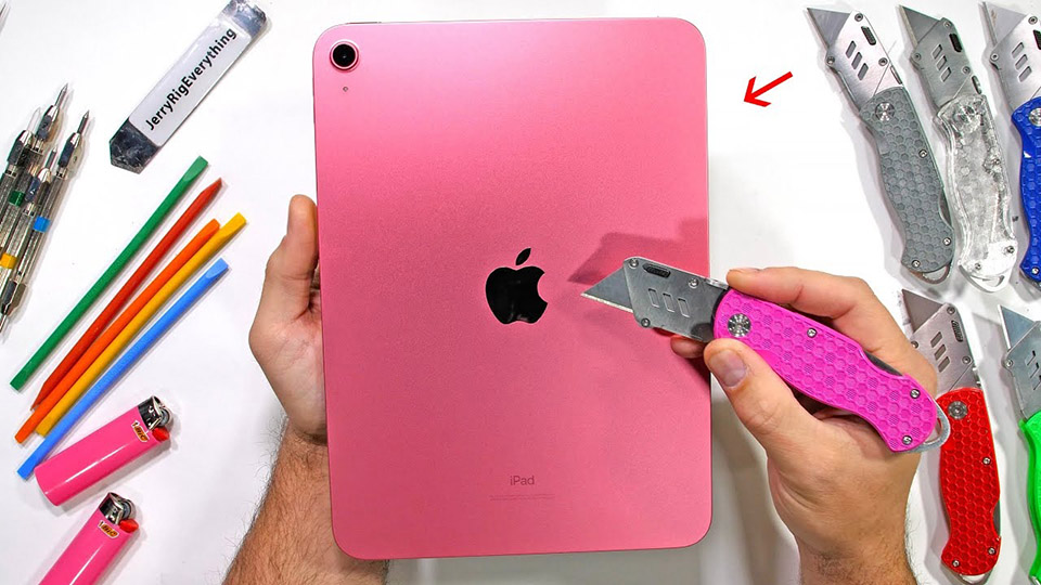Video tra tấn chiếc iPad Gen 10 dài 10 phút. Như thường lệ, Zack Nelson bắt đầu bằng màn tra tấn bằng dao rọc giấy. Trên thang đo độ cứng Mohs, màn hình iPad Gen 10 có các vạch nhìn thấy được ở cấp độ 6 và các rãnh sâu hơn ở cấp độ 7. Sau đó, các cạnh của máy tính bảng sẽ được kiểm tra vết xước. YouTuber nói rằng nó được làm bằng nhôm anodized. Nút nguồn kiêm chức năng quét vân tay không trầy xước. Tuy nhiên, mặt sau dễ bị trầy xước và chúng ta có thể thấy Zack đang phác thảo một nhân vật hoạt hình.