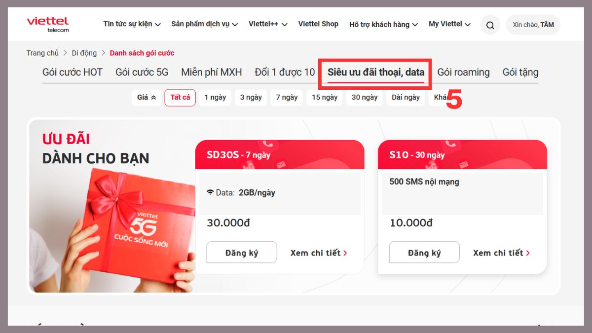 - Bước 4: Lựa chọn mục Siêu ưu đãi thoại, data hoặc sử dụng thanh tìm kiếm để nhanh chóng tìm gói cước phù hợp với nhu cầu.