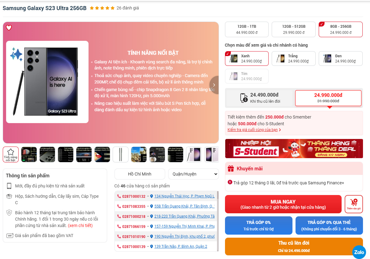 Đó là những con số được thống kê theo SellCell tại thị trường nước ngoài. Thực tế ở Việt Nam cũng ta vẫn có thể dễ dàng thấy được sự rớt giá tại các cửa hàng bán lẻ. Chiếc Galaxy S23 Ultra 256GB có giá niêm yết là 31.99 triệu sau 1 năm ra mắt, giá bán hiện tại của sản phẩm là 24.99 triệu tại hệ thống bán lẻ CellphoneS, điều này có nghĩa là nó đã sụt giảm khoảng 22%. Đối thủ của nó, chiếc iPhone 14 Pro Max 256 GB có giá niêm yết tại thời điểm ra mắt là 32.99 triệu, hiện giá bán của nó là 27,99 triệu đồng và hầu như không hề có chương trình khuyến mãi giảm giá sâu, vậy là iPhone 14 Pro Max chỉ mất khoảng 15% giá trị so với trước đây.