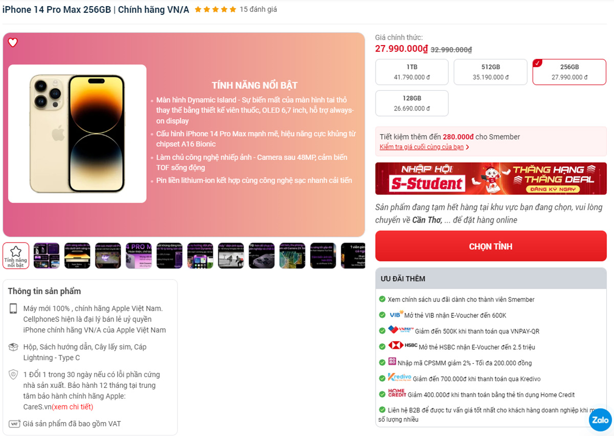 Thêm một ví dụ khác, chiếc iPhone 14 Pro Max 512GB đang được CellphoneS hỗ trợ thu lại từ người dùng với tình trạng tốt nhất là khoảng 19.5 triệu đồng, tương tự với S23 Ultra phiên bản 256GB là khoảng 13.9 triệu đồng. Vậy nếu sau một năm sử dụng bạn có nhu cầu bán lại cho cửa hàng để lên đời thì đối với iPhone người dùng sẽ được thu với giá cao hơn so với chiếc smartphone nhà Samsung trong cùng phân khúc giá.