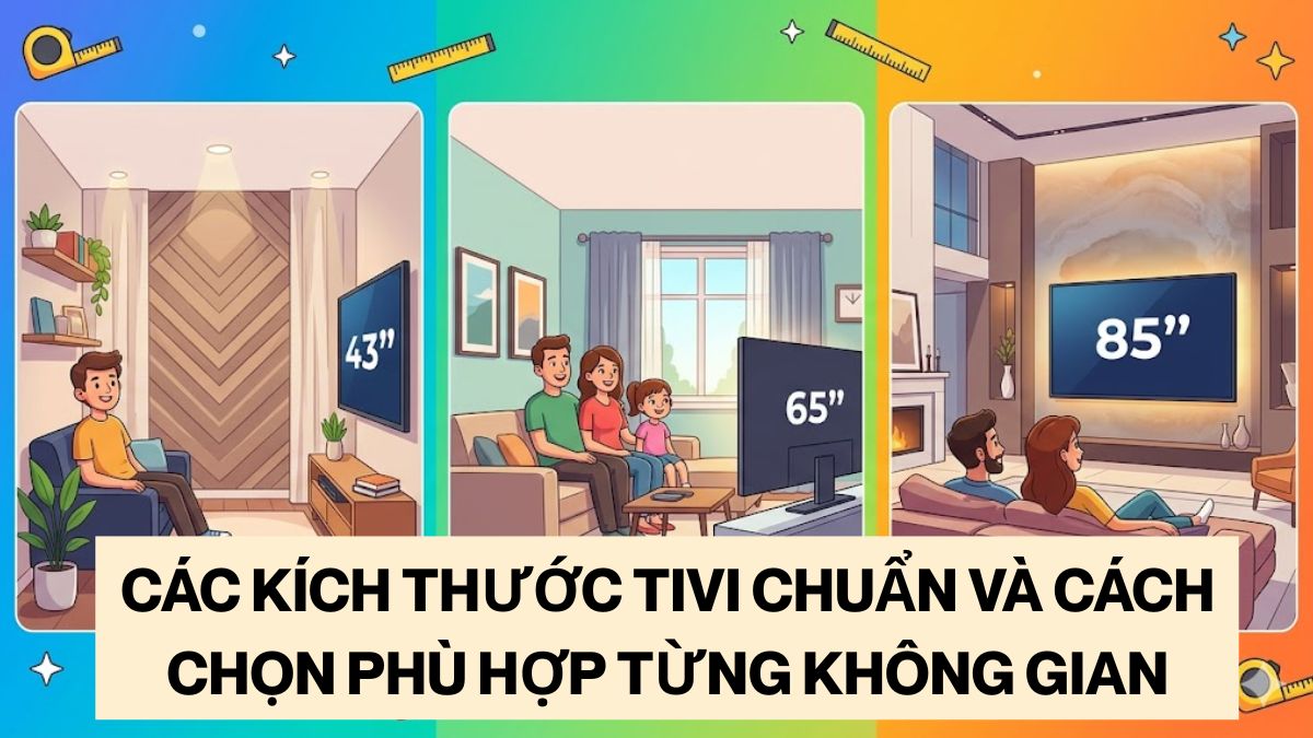 Để chọn kích thước tivi phù hợp, bạn cần cân nhắc diện tích phòng, không gian lắp đặt và nhu cầu sử dụng nhằm đảm bảo trải nghiệm xem thoải mái và cân đối với nội thất.