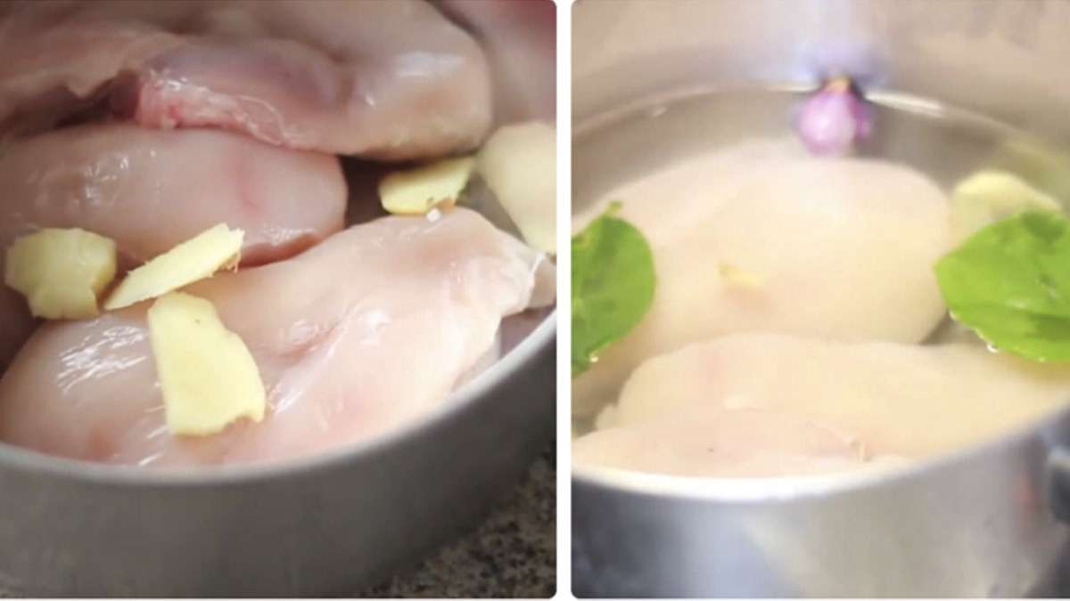 Rửa sạch thịt gà và cho vào nồi. Thêm 3-4 lá chanh, 1 muỗng cà phê muối, 2 cọng sả đập dập, vài lát gừng. Đổ nước đến mức gà được ngập và đun sôi để luộc gà.