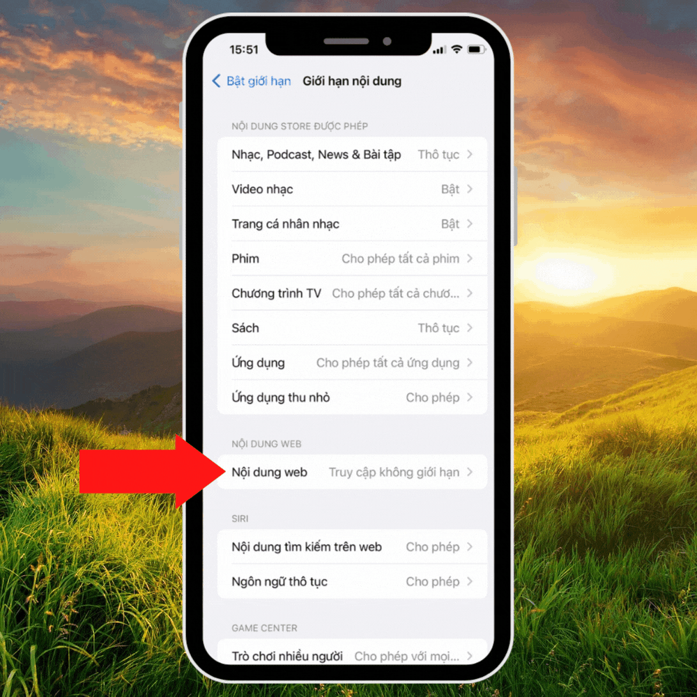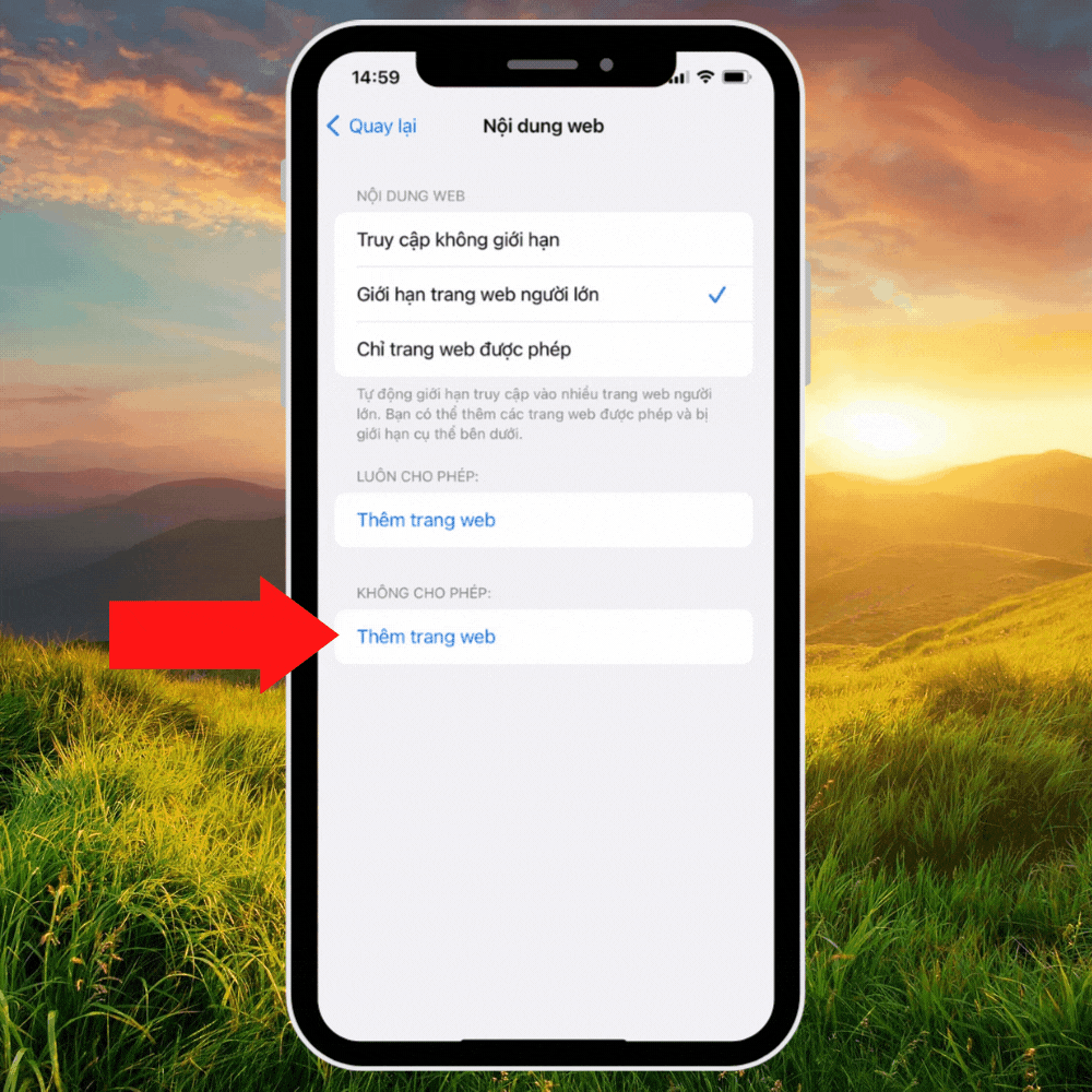 Bước 4: Cuối cùng, bạn ấn vào Nội dung web và chọn mục Giới hạn trang web người lớn.