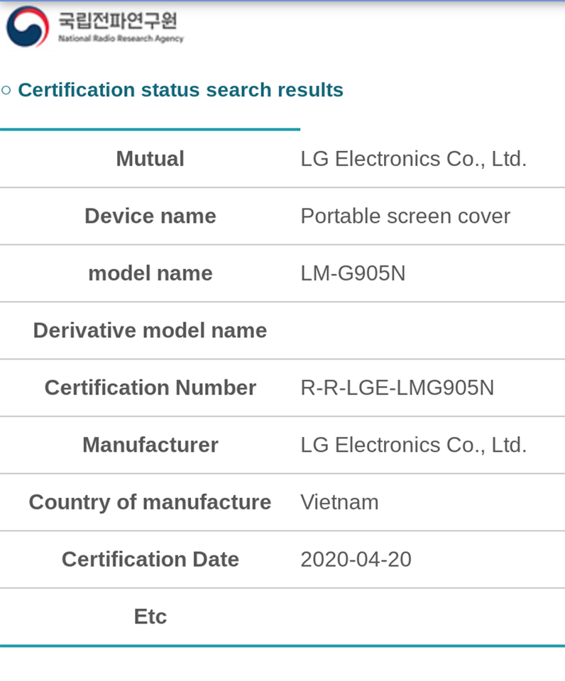 Cụ thể, theo trang web chính thức của NRRA của Hàn Quốc, nơi điều chỉnh các thiết bị điện tử không dây, LG đã đạt được chứng nhận cho một thiết bị có tên model LM-G905N, được mô tả là phụ kiện màn hình cho điện thoại di động.