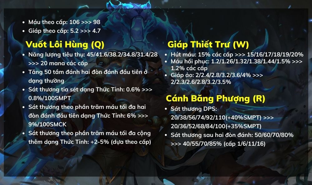 Vuốt Lôi Hùng (Q) được Riot buff khá mạnh tay. Năng Lượng Tiêu Hao của kỹ năng giảm xuống còn 20 mọi cấp độ và được bổ sung thêm hai hiệu ứng mới. Hiệu ứng dạng thường tăng Phạm Vi Tấn Công lên 50 ở hai đòn đánh đầu. Dạng Thức Tỉnh gây thêm Sát Thương Vật Lý theo phần trăm máu tối đa cho mục tiêu trên hai đòn đầu tiên. Cánh Băng Phượng(R) bị giảm sát thương và tốc độ xoáy ở giai đoạn đầu trận. Nhìn chung, việc nerf khả năng chống chịu của Udyr sẽ khiến ông dễ bị hạ gục hơn. Nhưng không vì thế mà Udyr sẽ quá yếu, lượng sát thương trả lại buộc bạn phải cân nhắc đấy.