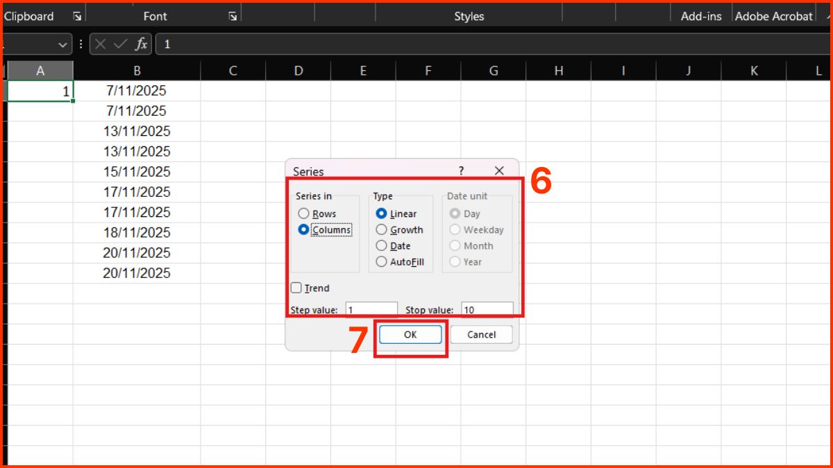 - Chọn Linear trong mục Type để Excel tự điền số theo bước tăng đều.