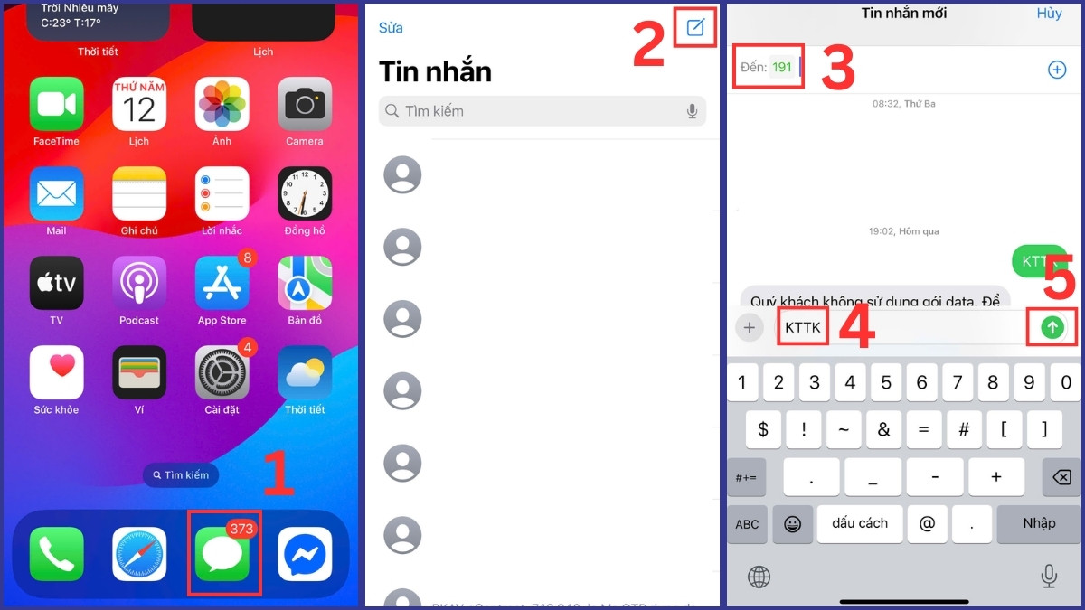 - Cách 2: Vào ứng dụng Tin nhắn → Soạn Tin nhắn mới với nội dung “KTTK” → Gửi 191.