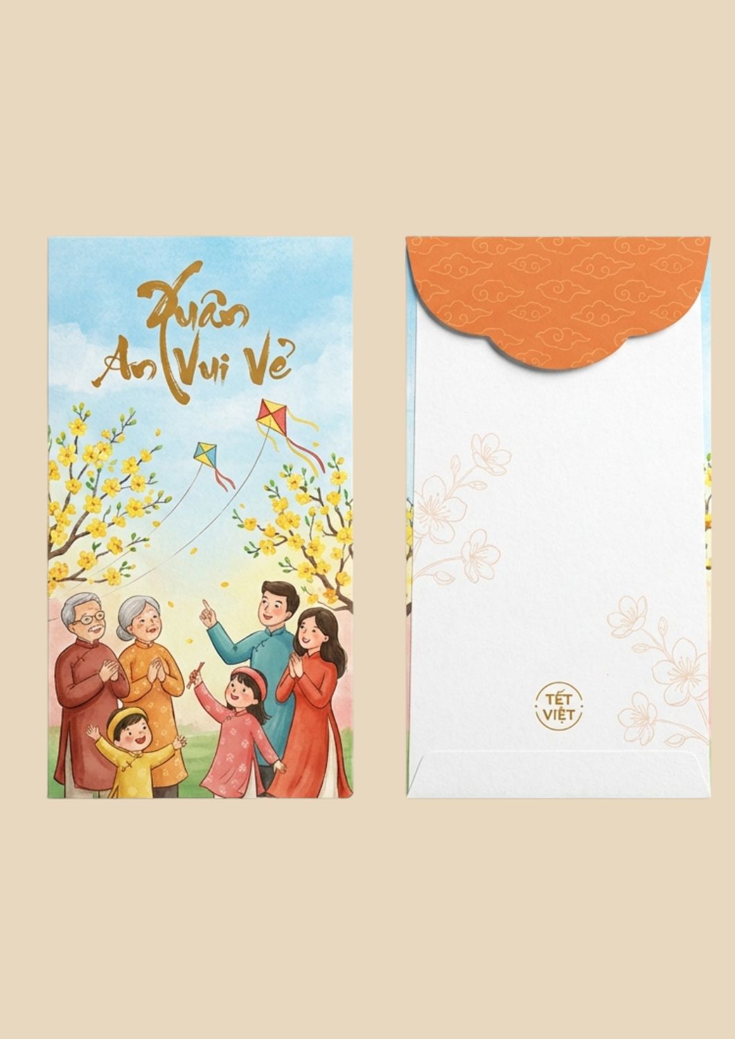 Phong cách dân gian mang đến cảm giác gần gũi, thân thuộc thông qua hình ảnh làng quê, mái nhà, cây đào, nồi bánh chưng và những bữa cơm sum vầy. Những mẫu bao lì xì Tết theo phong cách này gợi lại ký ức Tết xưa, tạo cảm giác ấm áp và rất phù hợp với tinh thần đoàn tụ của năm mới.