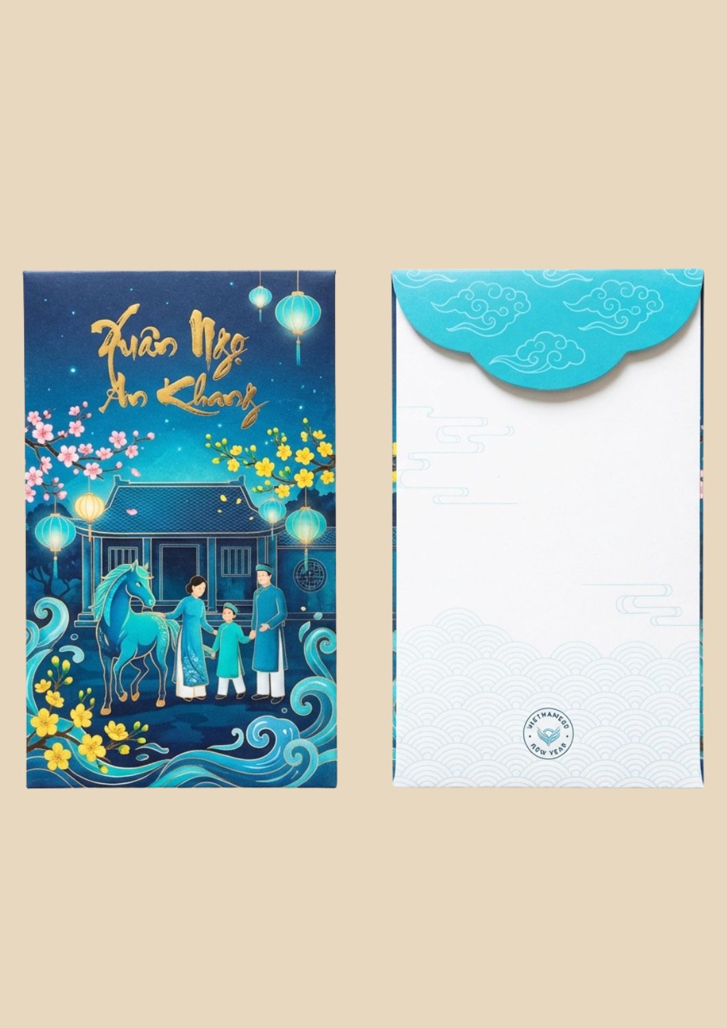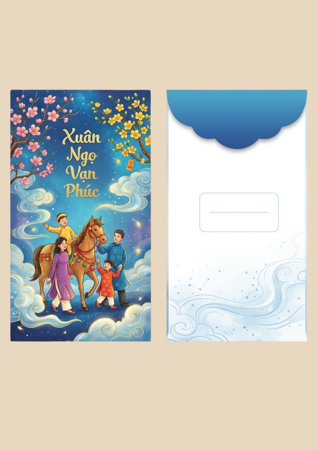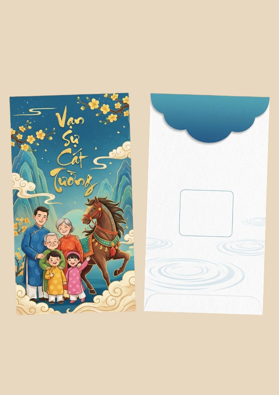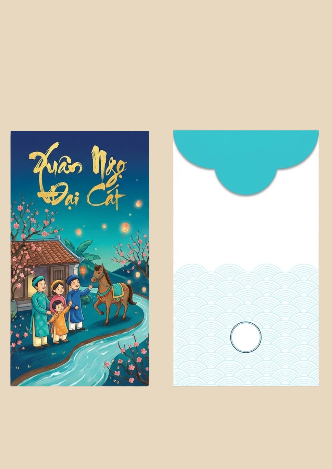 Xanh Thiên Hà Thủy là gam màu được nhiều người quan tâm trong năm 2026 nhờ ý nghĩa về sự chuyển động, trí tuệ và phát triển bền vững. Khi đưa vào thiết kế bao lì xì Tết, sắc xanh này tạo nên một diện mạo hiện đại, thanh lịch nhưng vẫn giữ được tinh thần xuân thông qua các họa tiết hoa, mây và linh vật ngựa.