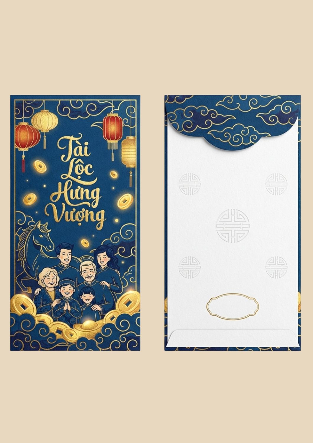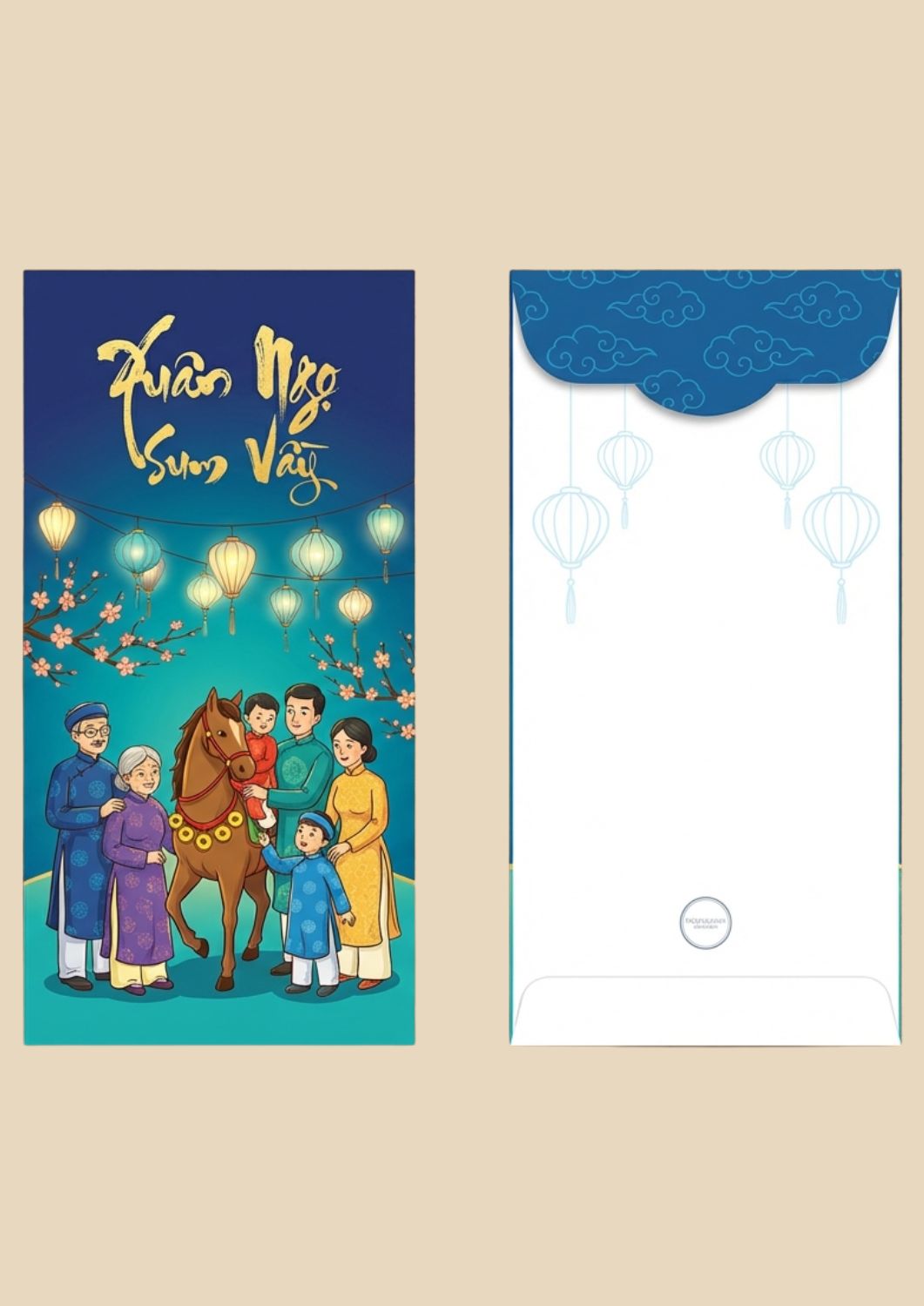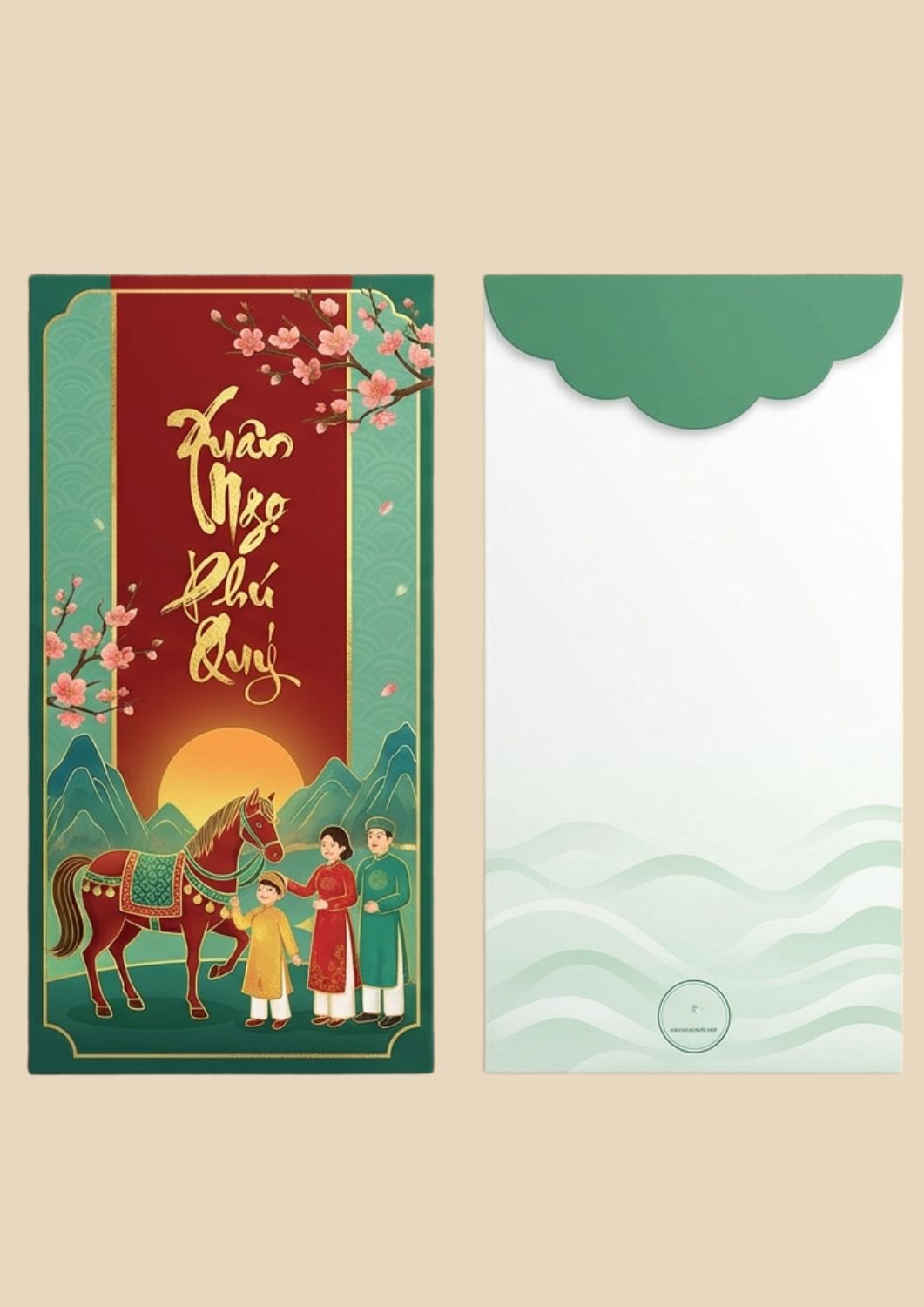 Xanh Thiên Hà Thủy là gam màu được nhiều người quan tâm trong năm 2026 nhờ ý nghĩa về sự chuyển động, trí tuệ và phát triển bền vững. Khi đưa vào thiết kế bao lì xì Tết, sắc xanh này tạo nên một diện mạo hiện đại, thanh lịch nhưng vẫn giữ được tinh thần xuân thông qua các họa tiết hoa, mây và linh vật ngựa.