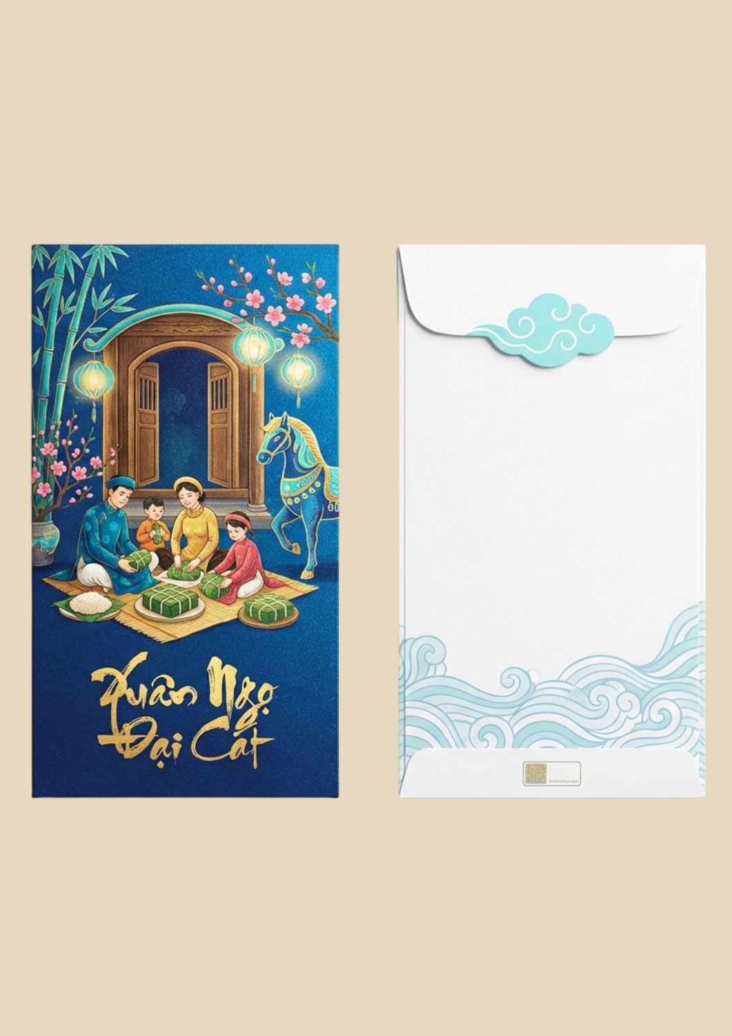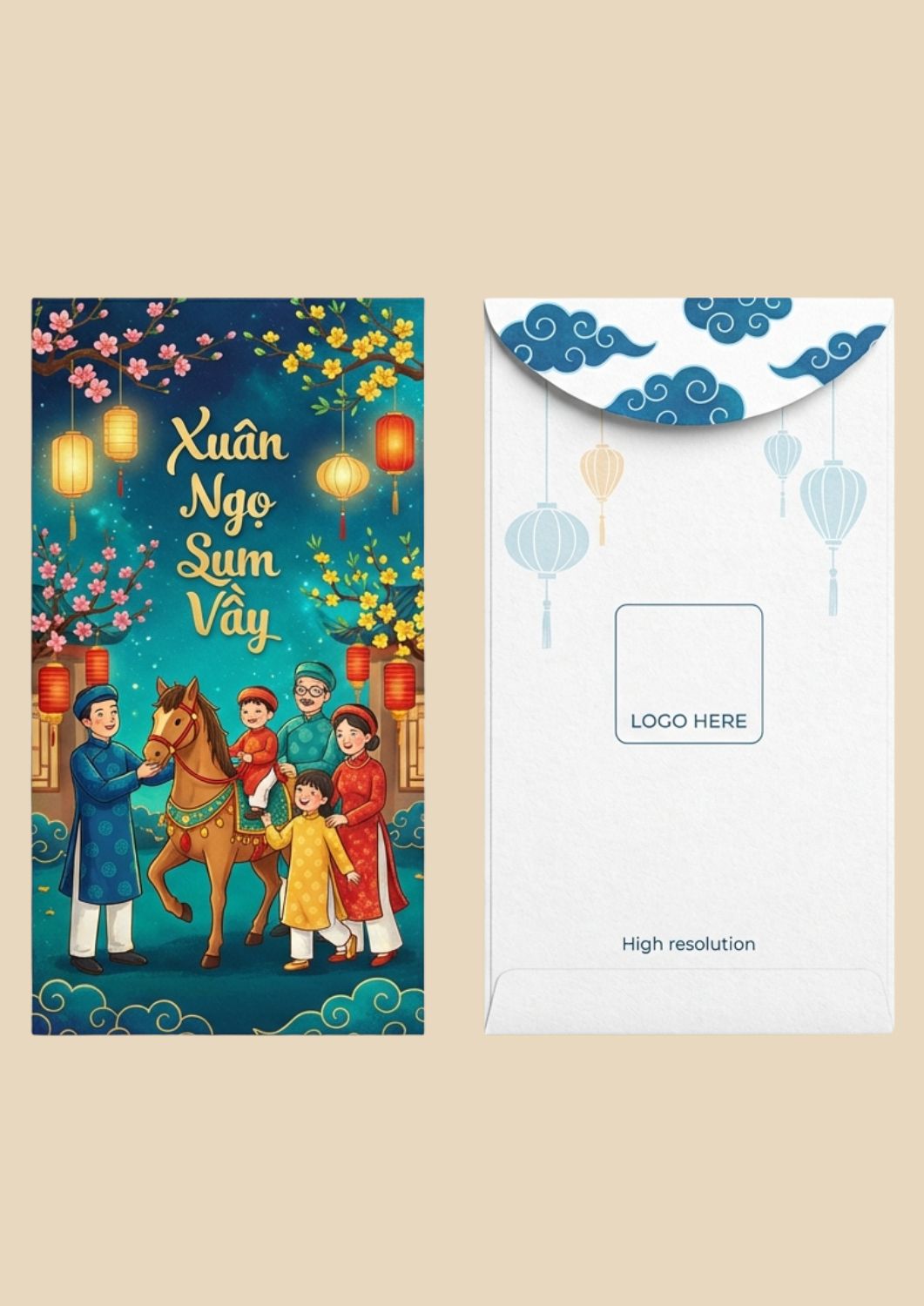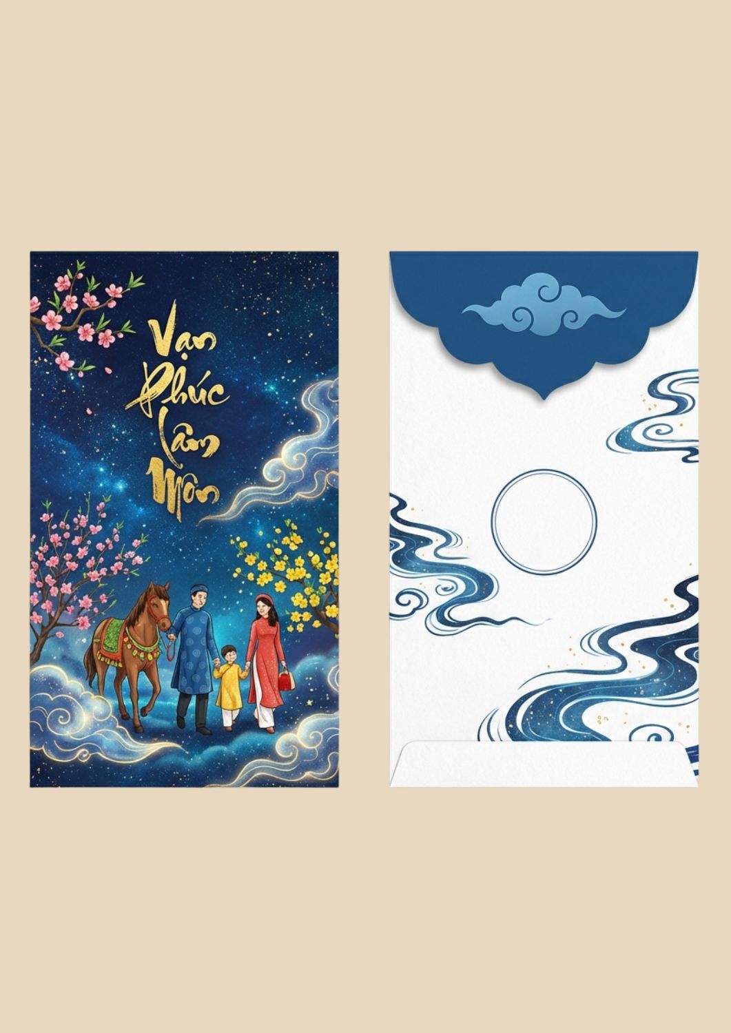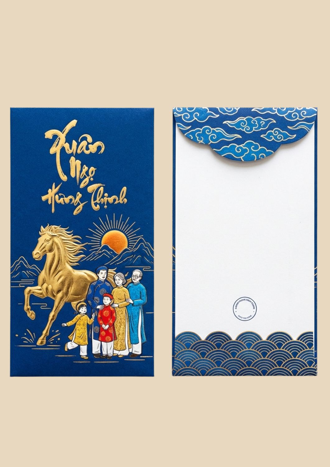 Xanh Thiên Hà Thủy là gam màu được nhiều người quan tâm trong năm 2026 nhờ ý nghĩa về sự chuyển động, trí tuệ và phát triển bền vững. Khi đưa vào thiết kế bao lì xì Tết, sắc xanh này tạo nên một diện mạo hiện đại, thanh lịch nhưng vẫn giữ được tinh thần xuân thông qua các họa tiết hoa, mây và linh vật ngựa.