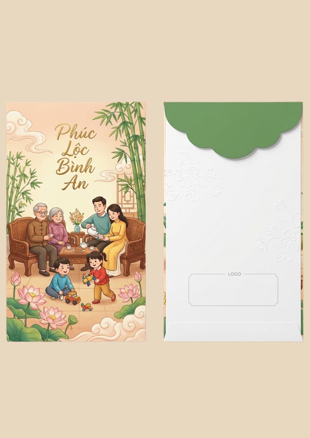 Trong khi đó, Art paper (giấy mỹ thuật) mang đến cảm giác cao cấp hơn nhờ bề mặt dày, cứng và khả năng ép kim, dập nổi hoặc phủ UV rất tốt. Các mẫu bao lì xì Tết in trên Art paper thường được dùng cho quà biếu, quà Tết đối tác hoặc các bộ quà cao cấp, giúp tổng thể trở nên sang trọng và chỉn chu hơn.