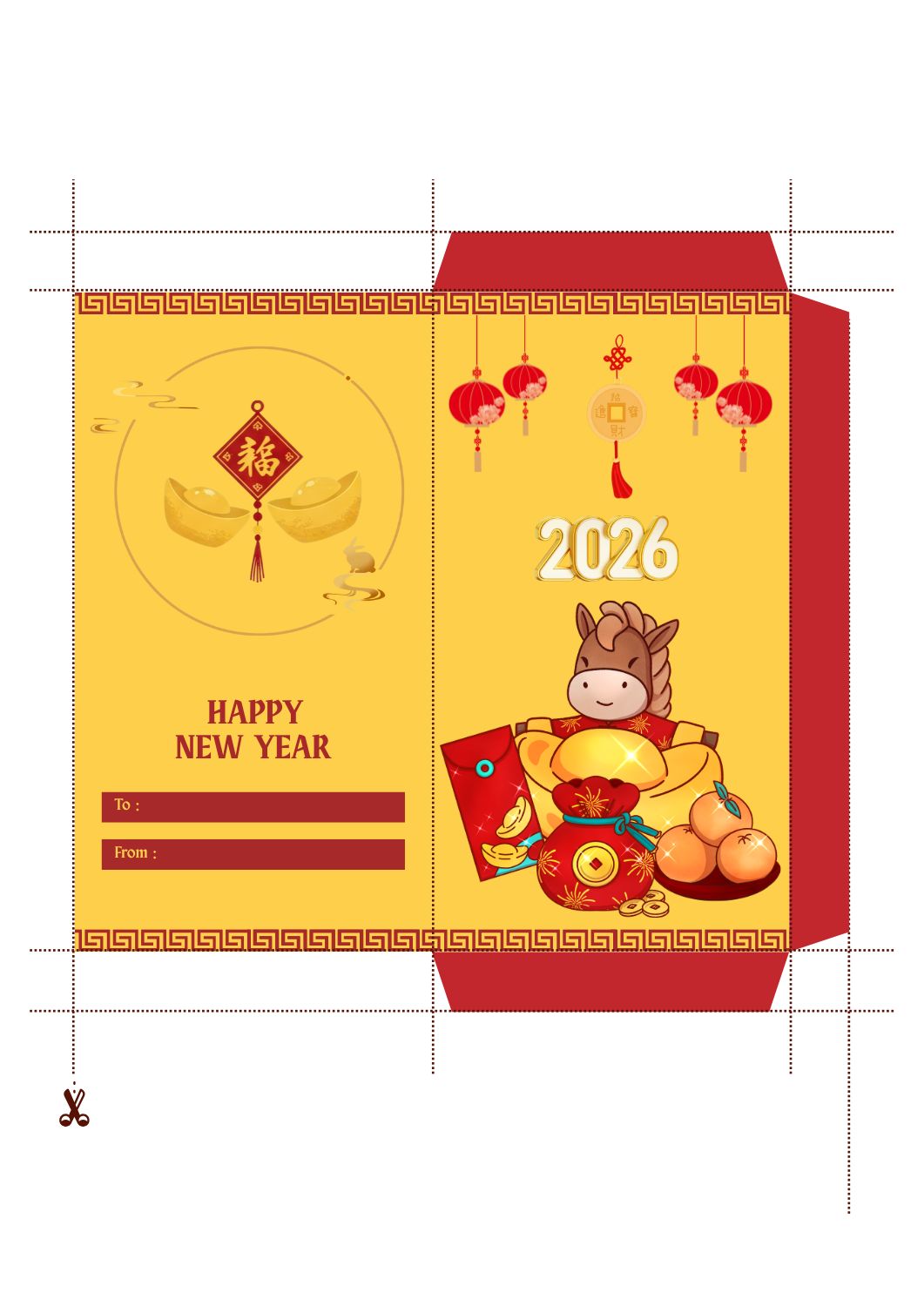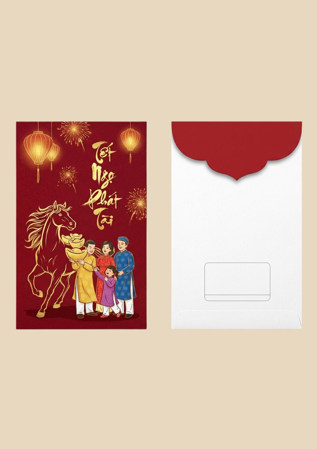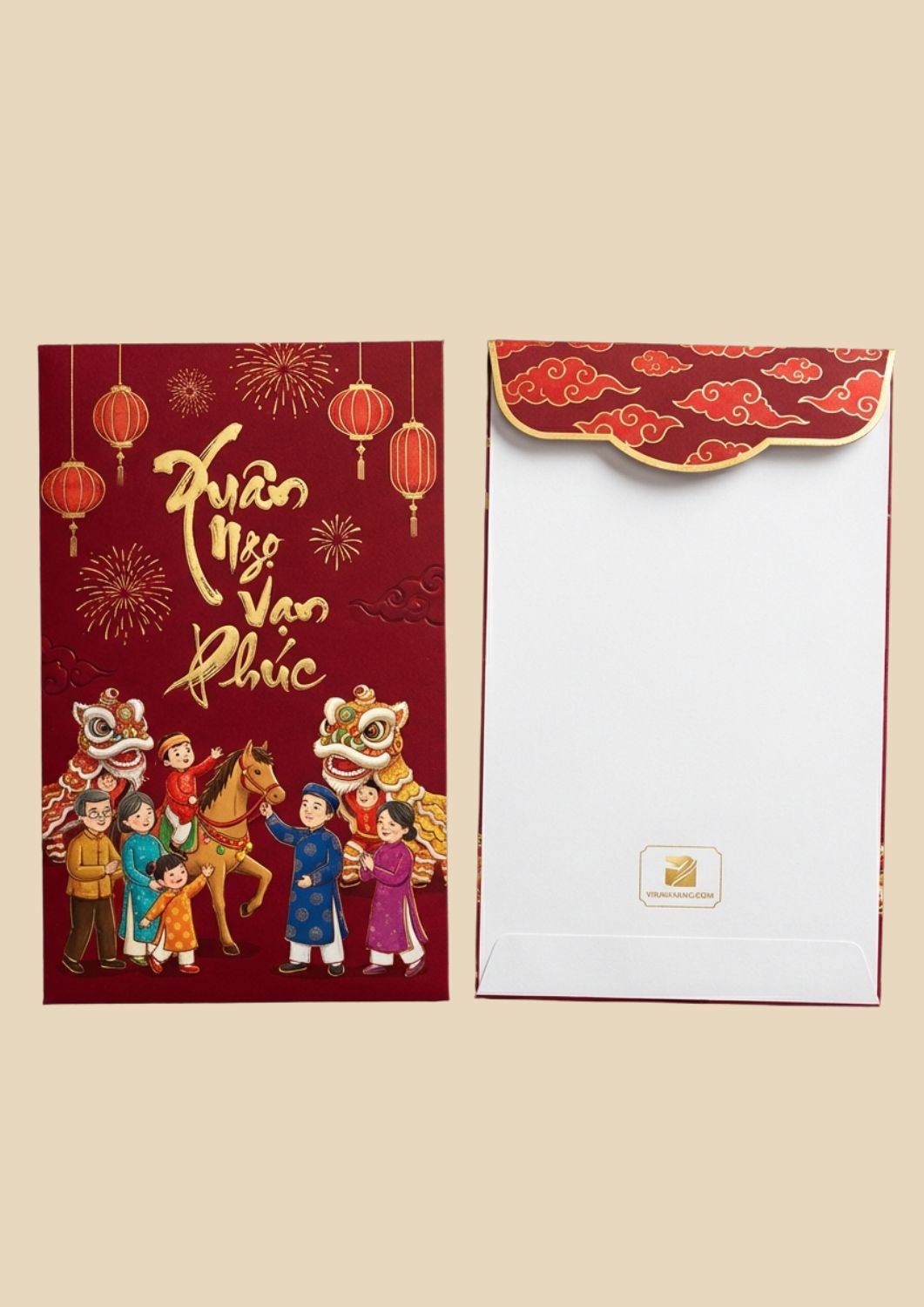 Đỏ và vàng luôn là hai màu sắc không thể thiếu trong Tết Việt, tượng trưng cho hỷ sự, tài lộc và phú quý. Các mẫu bao lì xì Tết Bính Ngọ 2026 sử dụng tông đỏ vàng thường kết hợp với hình ảnh ngựa, lân, pháo hoa và hoa xuân để tạo nên không khí rộn ràng, sang trọng và tràn đầy năng lượng tích cực.