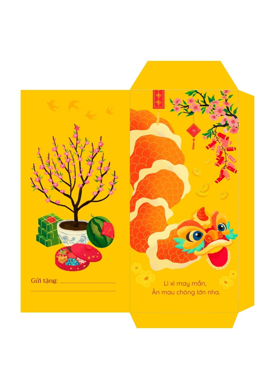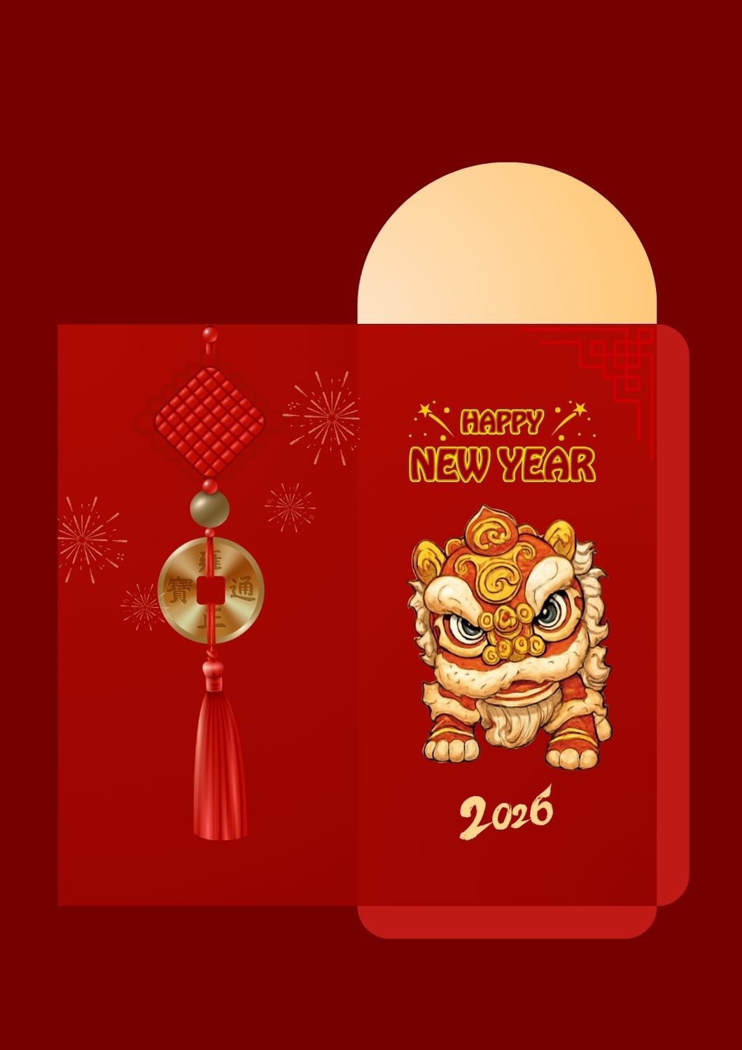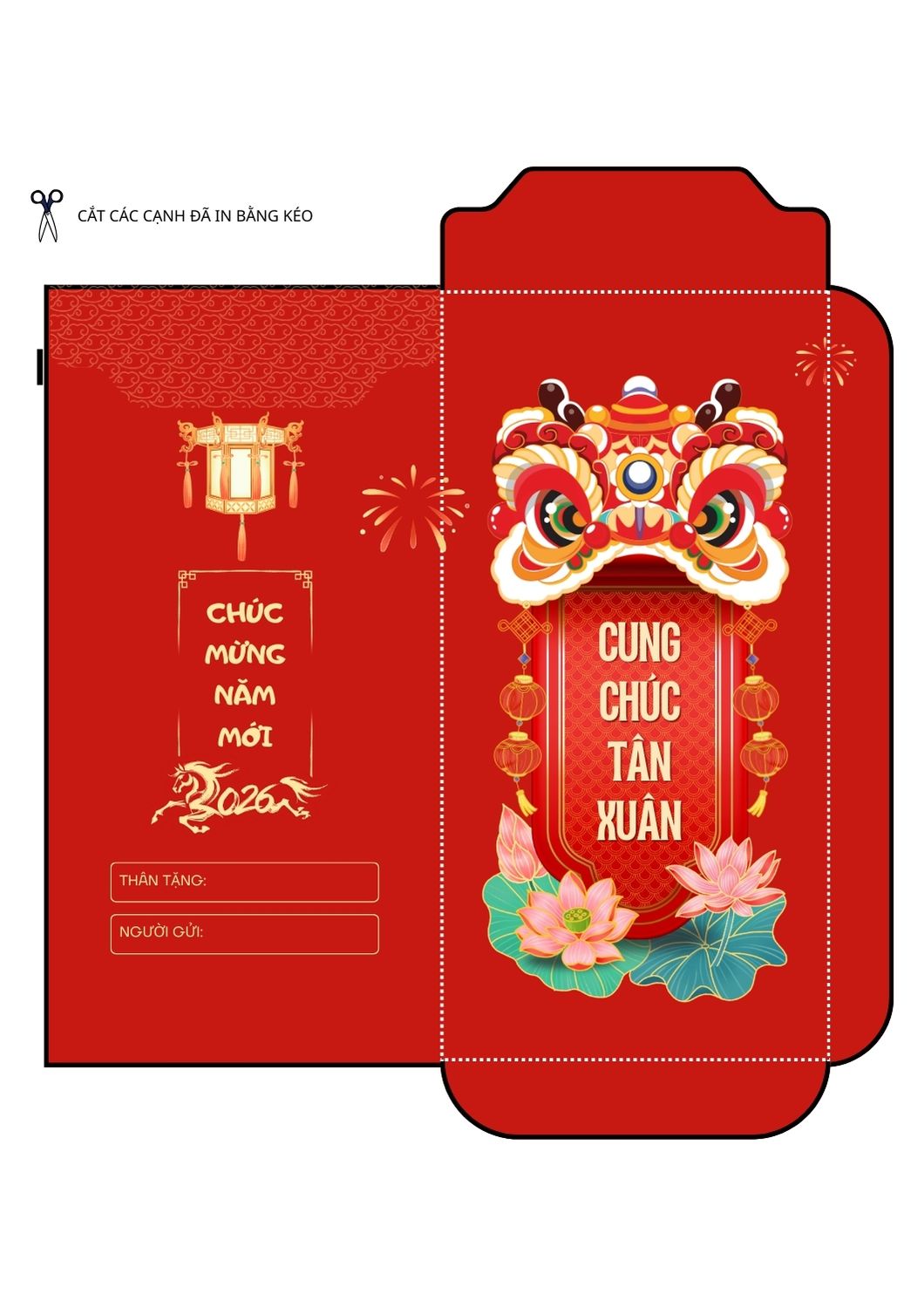 Hình ảnh lân từ lâu đã gắn liền với Tết cổ truyền, tượng trưng cho sự khởi đầu may mắn, xua đi điều xui rủi và mang tài lộc về cho gia đình. Trong các mẫu bao lì xì Tết Bính Ngọ 2026, hình lân thường được kết hợp với pháo hoa, hoa mai và các họa tiết cát tường, tạo nên một tổng thể rực rỡ, rất phù hợp với không khí đầu năm mới.