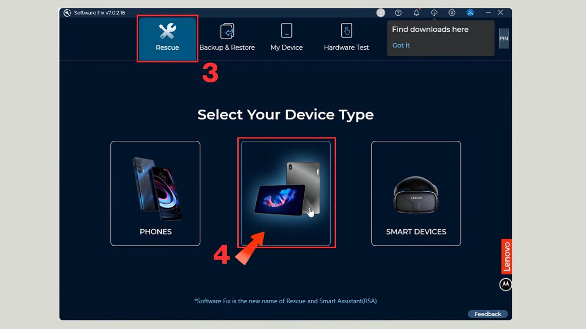- Mở RSA, chọn mục "Rescue" (Cứu hộ) và chọn loại thiết bị là "Tablet".
