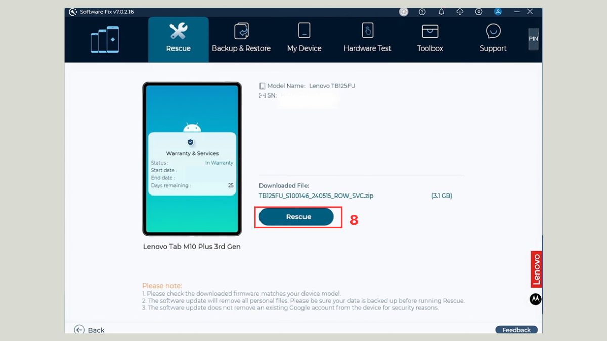 - Nhấn nút "Rescue" (Khôi phục) trên máy tính.
