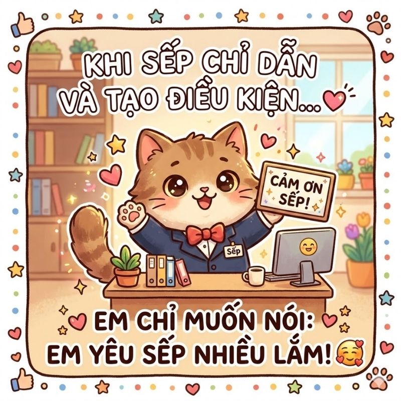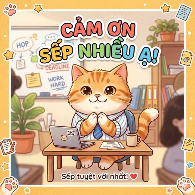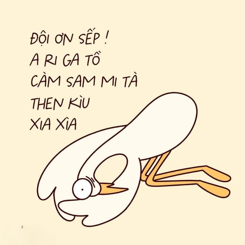 Meme cảm ơn sếp thường mang phong cách lịch sự nhưng vẫn có chút hài hước nhẹ, như hình ảnh nhân vật cúi đầu, chắp tay cảm ơn hoặc dòng chữ “thank you boss”. Những meme này giúp thể hiện sự biết ơn với cấp trên mà vẫn giữ không khí thoải mái, miễn là nội dung đủ tinh tế và phù hợp môi trường công việc.