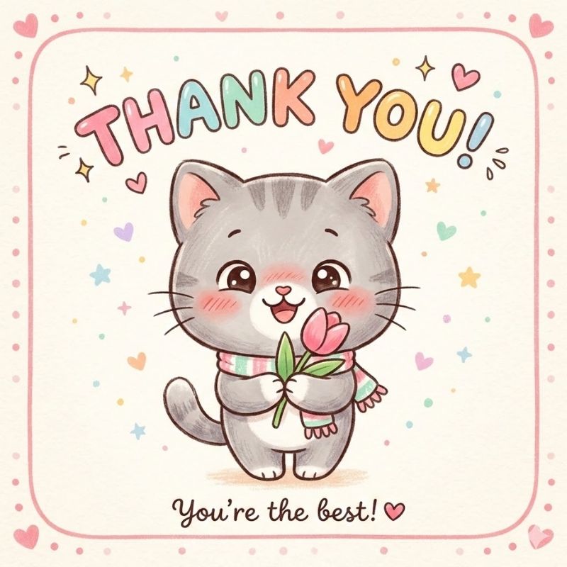 Meme cảm ơn cute thường sử dụng hình ảnh động vật hoặc nhân vật hoạt hình với biểu cảm đáng yêu như mèo chắp tay, gấu bông cười tươi hay nhân vật anime dễ thương. Những meme này giúp lời cảm ơn trở nên nhẹ nhàng, thân thiện và được nhiều người yêu thích khi trò chuyện với bạn bè hoặc người thân.