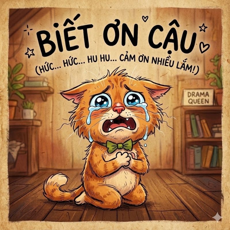 Nếu muốn tạo không khí vui vẻ, bạn có thể dùng meme ảnh cảm ơn hài hước với biểu cảm “quá lố” như mèo lăn lộn cảm ơn, nhân vật khóc vì xúc động hoặc cười lớn. Những meme này giúp lời cảm ơn thú vị hơn khi trò chuyện với bạn bè hoặc bình luận trên mạng xã hội.