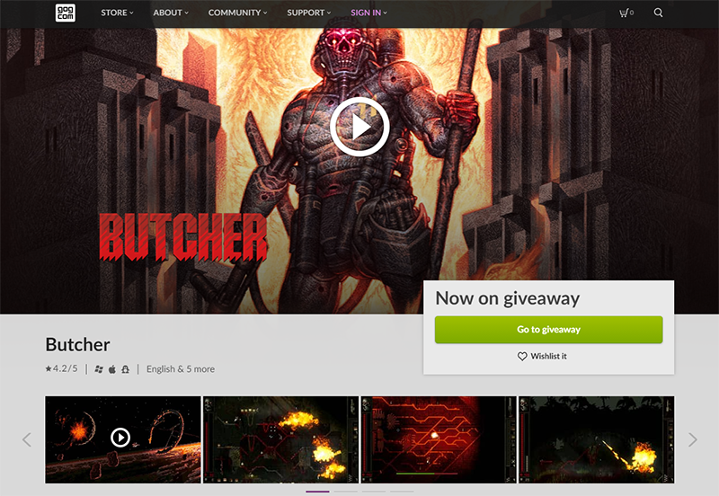 Các bạn có thể truy cậplink sau đâyđể tải về tựa game này.Để nhận được tựa game này, bạn chỉ cần tạo tài khoản GOG (nếu chưa có) truy cập vào link tựa game Butcher Nhấn Get it Free để nhận game.