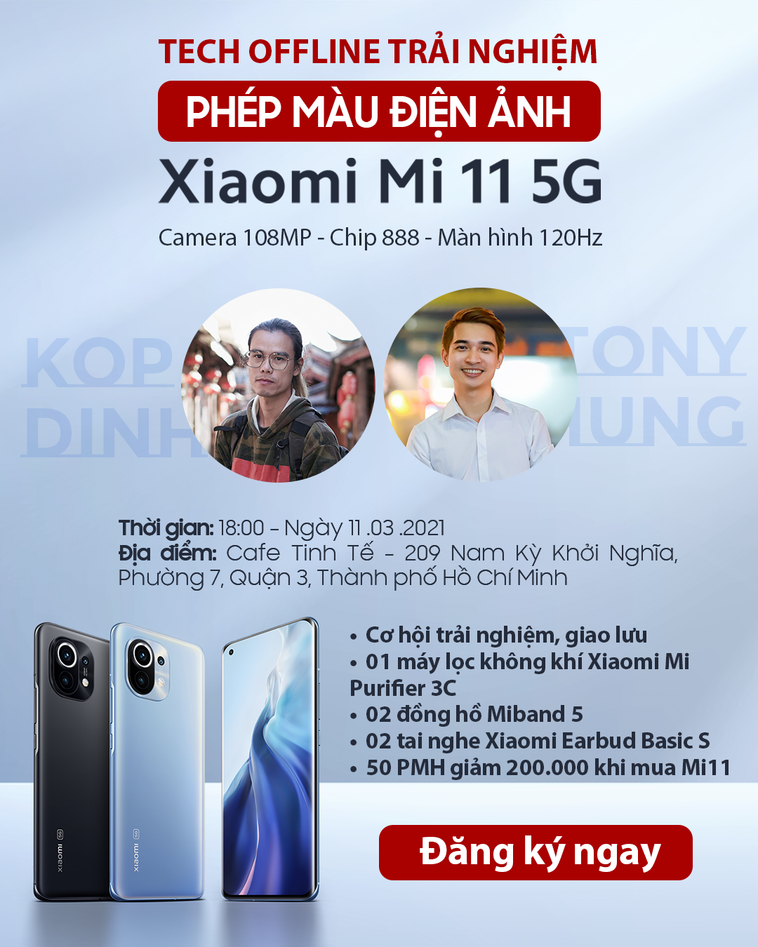 Tại buổi offline trải nghiệm này. Quý khách hàng, độc giả sẽ được tận tay trải nghiệm những tính năng hấp dẫn nhất của Xiaomi Mi 11. Được kiểm chứng sức mạnh của con chip Snapdragon 888 và khả năng chiến game “không đối thủ” mà mẫu Xiaomi Mi 11 có được.Ngoài ra, các tính năng về camera cũng sẽ được chia sẻ trải nghiệm thực tế dưới góc nhìn của Youtuber nổi tiếng KOP Đinh.Khách mời của chương trình là Reviewer công nghệ Tony Phùng sẽ cùng tham gia và gửi đến những cảm nhận cá nhân của anh sau một thời gian sử dụng Xiaomi Mi 11. Từ đó giúp quý khách hàng có được cảm nhận chính xác về sản phẩm và dễ dàng đưa ra quyết định mua hàng hơn.Không chỉ được trực tiếp trải nghiệm sản phẩm và nghe chia sẻ từ các khác mời. Khi tham gia tech offline các bạn sẽ nhận được những phần quà cực hấp dẫn từ CellphoneS cụ thể như sau: