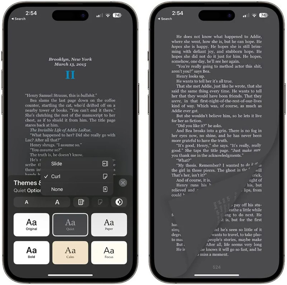 Trong đó, Lật sang bên là hoạt ảnh mặc định của iOS 16, còn Cuộn tròn là hoạt ảnh cũ của iOS 15 trở về trước và Không có gì là hoạt ảnh đơn giản hơn, chỉ cần chuyển từ trang này sang trang khác. Các tính năng này cũng có sẵn trong iPadOS 16.4 dành cho những người đọc trên iPad.
