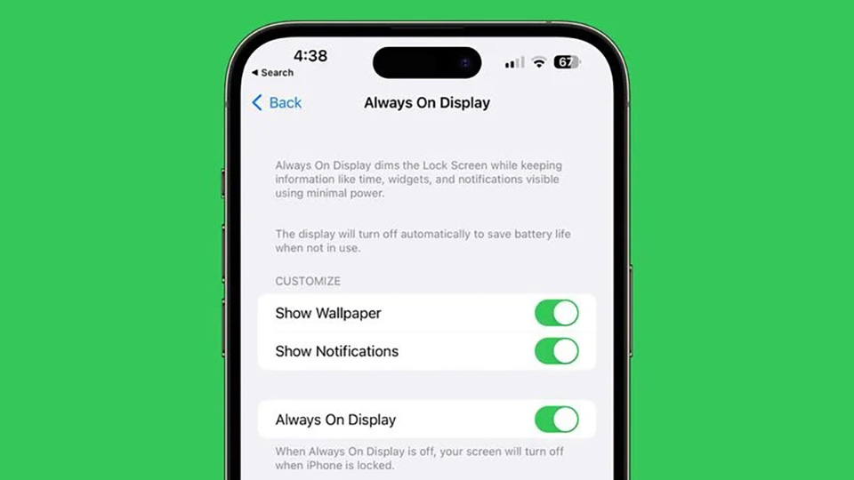 Apple đã thực hiện một số điều chỉnh nhỏ đối với phần Always On Display trong ứng dụng Cài đặt trên các mẫu iPhone 14 Pro. Thanh gạt để tắt tính năng AOD hiện được liệt kê bên dưới các thanh gạt để hiển thị hình nền và thông báo, thay vì nằm trên như trước đây.