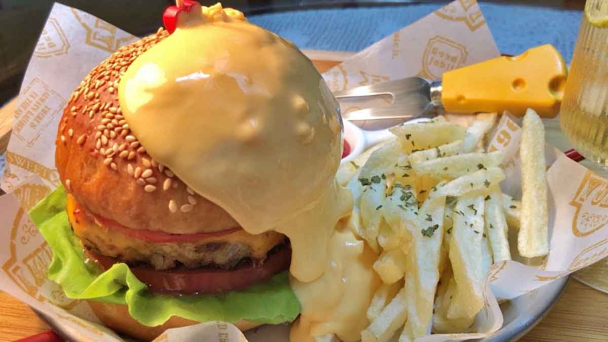 Nướng miếng thịt trên bếp nướng trong vài phút mỗi mặt, đặt phô mai lên thịt để chảy trong những phút cuối cùng. Đảm bảo thịt đạt nhiệt độ bên trong 70°C. Thoa nước sốt lên vỏ bánh và bắt đầu xây dựng bánh. Thêm dưa chuột, rau diếp, cà chua, hành tím và miếng thịt, sau đó đậy bằng vỏ bánh còn lại.