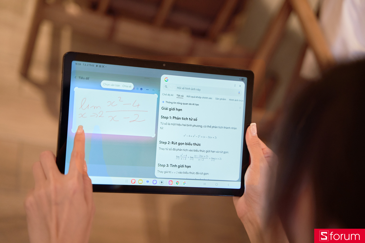 Ngoài ra, Galaxy Tab A11+ còn hỗ trợ Giải toán tự động trong ứng dụng Ghi chú, giúp đưa ra kết quả nhanh chóng. Kết hợp với tính năng Khoanh tròn để tìm kiếm có thể giúp bạn khi cần phân tích đề bài và đưa ra lời giải chi tiết từng bước nhanh chóng. Đây là công cụ đắc lực cho việc học tập và làm bài tập mỗi ngày. Nhờ đó, người dùng có thể tiếp cận kiến thức dễ dàng hơn, chủ động và nâng cao hiệu quả học tập.