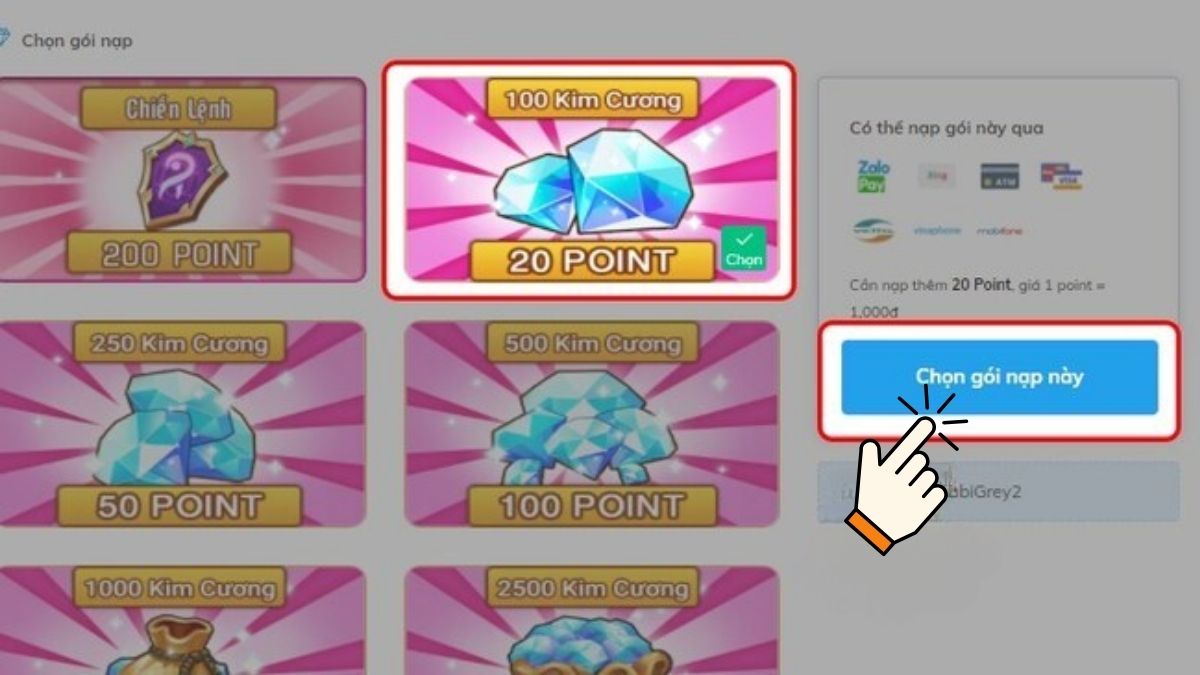 Bước 1: Các bước đăng nhập ban đầu tương tự như các phương thức khác. Truy cập trang nạp thẻ game, đăng nhập tài khoản. Sau đó, chọn nhân vật và gói mong muốn rồi bấm vào 'Chọn gói nạp này'.